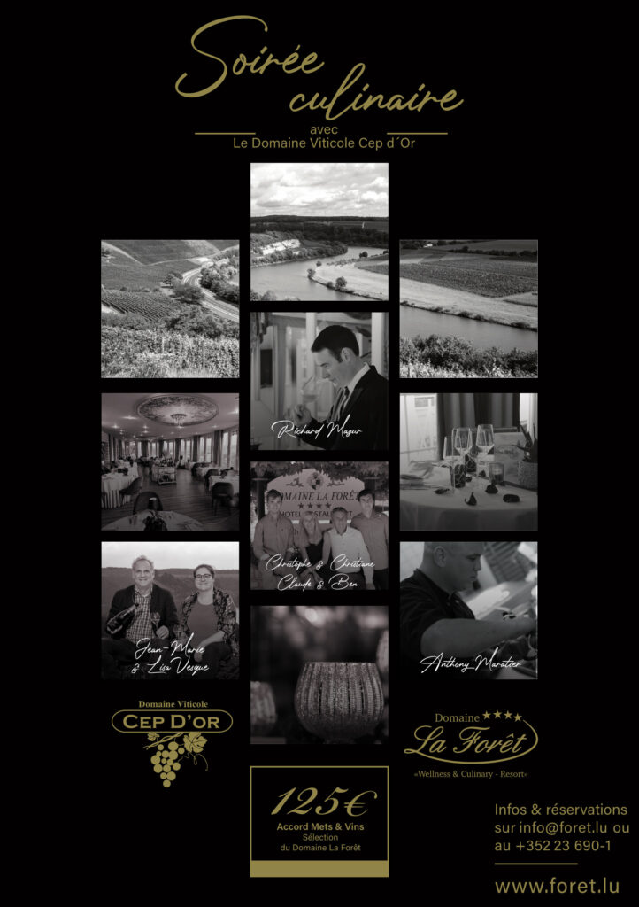 Für einen Abend freut sich die Domaine La Forêt, die Cave Cep d'Or zu einem Erlebnis begrüßen zu dürfen, bei dem Speisen und Weine perfekt aufeinander abgestimmt sind: eine Speisen- und Weinkombination, die rund um ihre Weine kreiert wurde und die Sie im Laufe des Abendessens entdecken können.